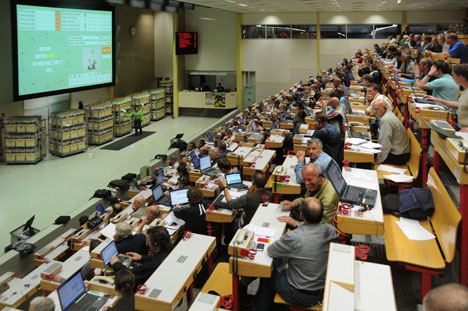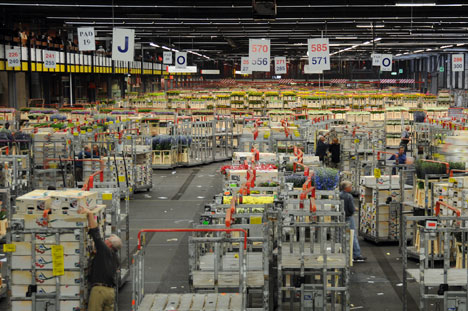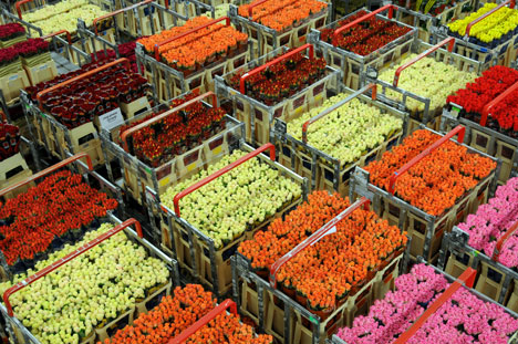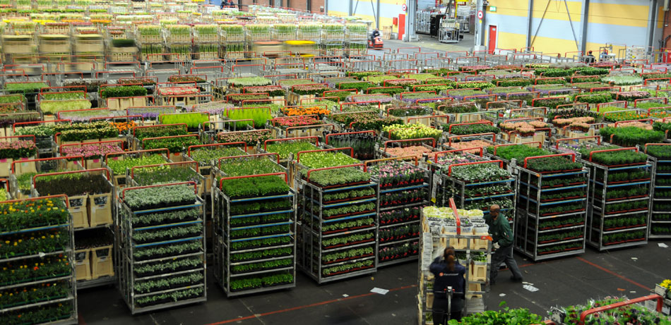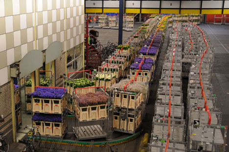 Beeindruckend ist die riesige Versteigerungshalle mit einer Größe von mehr als 700 000 m², in der täglich weit mehr als 10 Millionen Blumen verkauft werden. | Mit diesen Dimensionen ist das das größte Handelshaus der Welt. Auf einem erhöhten Rundgang hat man die Möglichkeit, das Geschehen zu beobachten. Man bestaunt vor allem die Logistik, die das Funktionieren des Betriebes sicherstellt.