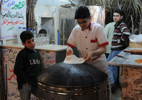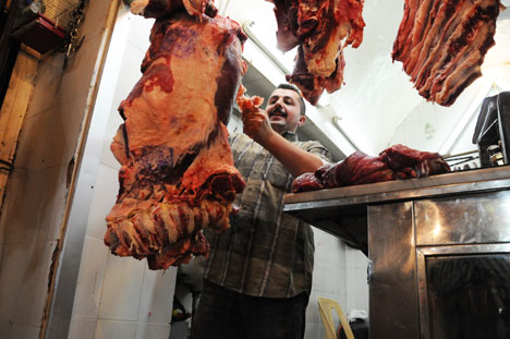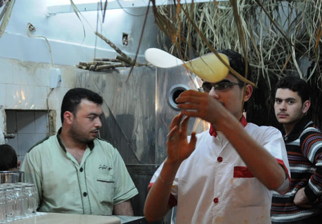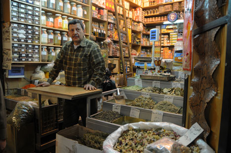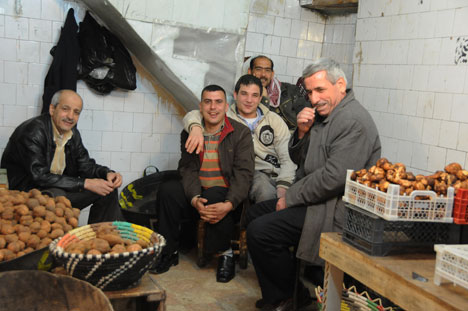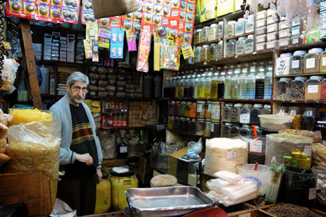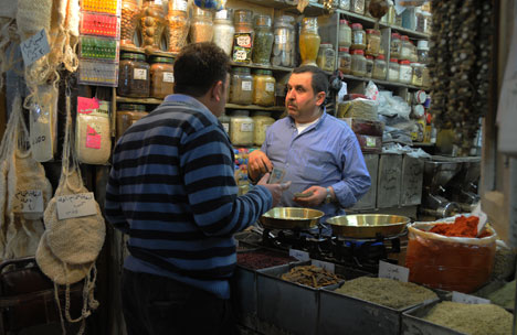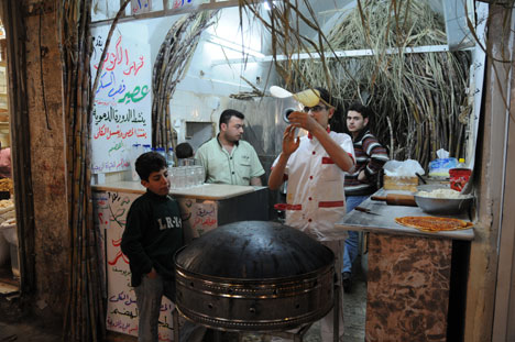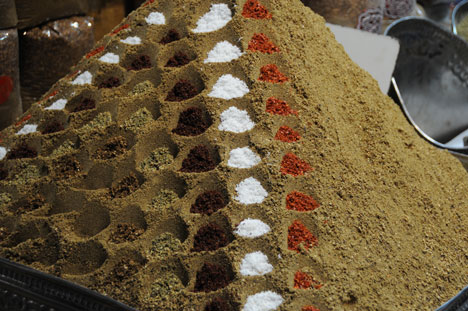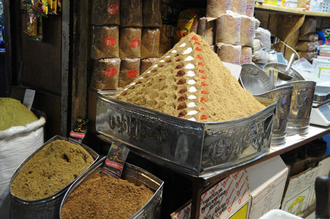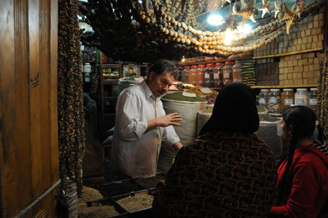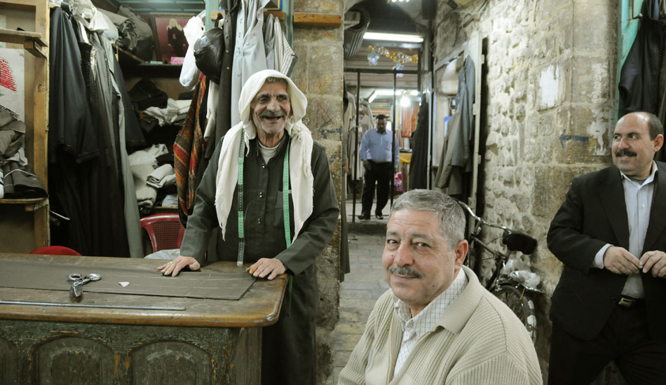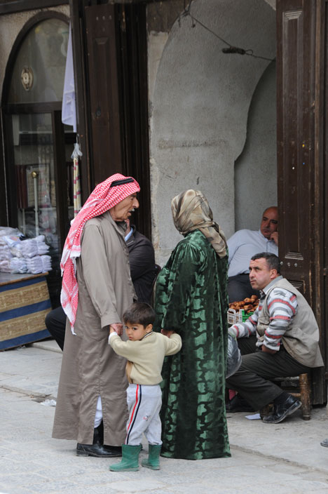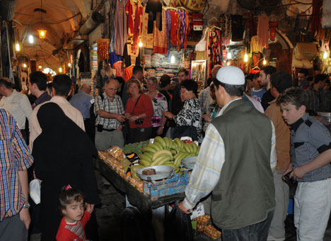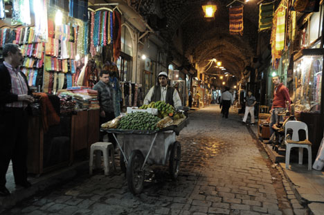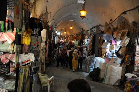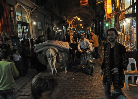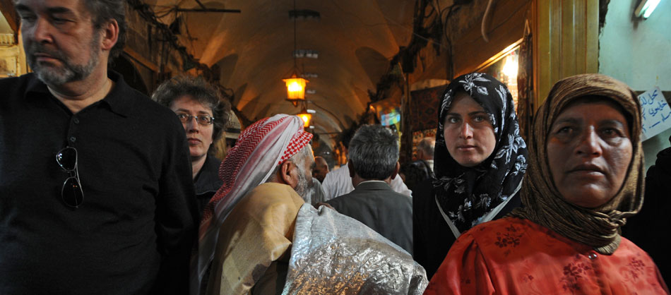 Suk/Souk/Suq/Basar Aleppo, sagt man, ist von jeher ein großer Marktplatz gewesen. Dafür war die Lage der Stadt an den wichtigsten Handelsrouten (Weihrauch-, Seidenstraße) in erster Linie verantwortlich. Und davon zeugt heute noch der Basar, der als der größte (überdachte) der Welt gilt. 12 Kilometer sind diese Gassen lang, die durch Kuppeln nur schwach natürlich beleuchtet sind. Einen kleinen Teil davon zeigt das Bild links von der Zitadelle aus gesehen. Dieser Basar hat noch viel von seiner Ursprünglichkeit bewahrt, ist noch nicht zu einem "Touristenmarkt" verkommen. Darauf legen die Bewohner von Aleppo Wert; viele von ihnen kaufen selbst noch dort ein. Wer eintaucht in dieses Labrinth arabischen Handelslebens, wird überwältigt von Lebendigkeit und Atmosphäre, von Farben und Düften, von der Fülle des Angebotenen - und von der Freundlichkeit der Menschen. |
